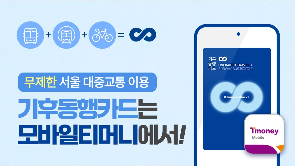 서울 지역에서 출시된 특별한 모바일 티머니 교통카드로, 버스, 지하철은 물론 따릉이까지 무제한으로 이용할 수 있는 패스권 형태입니다. 대중교통을 자주 이용하는 분들께 큰 혜택이 됩니다.