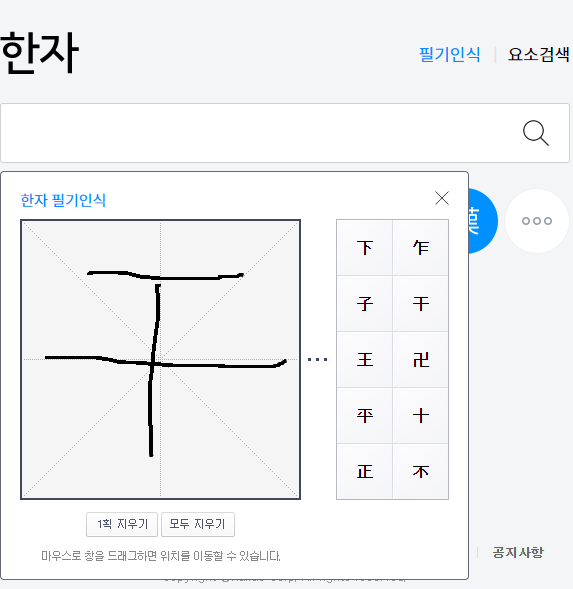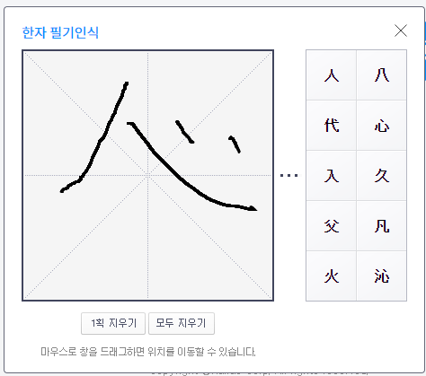 4. 필기인식 팝업창이 나오면 마우스나 터치로 알아보려는 한자를 화면에 그려줍니다.