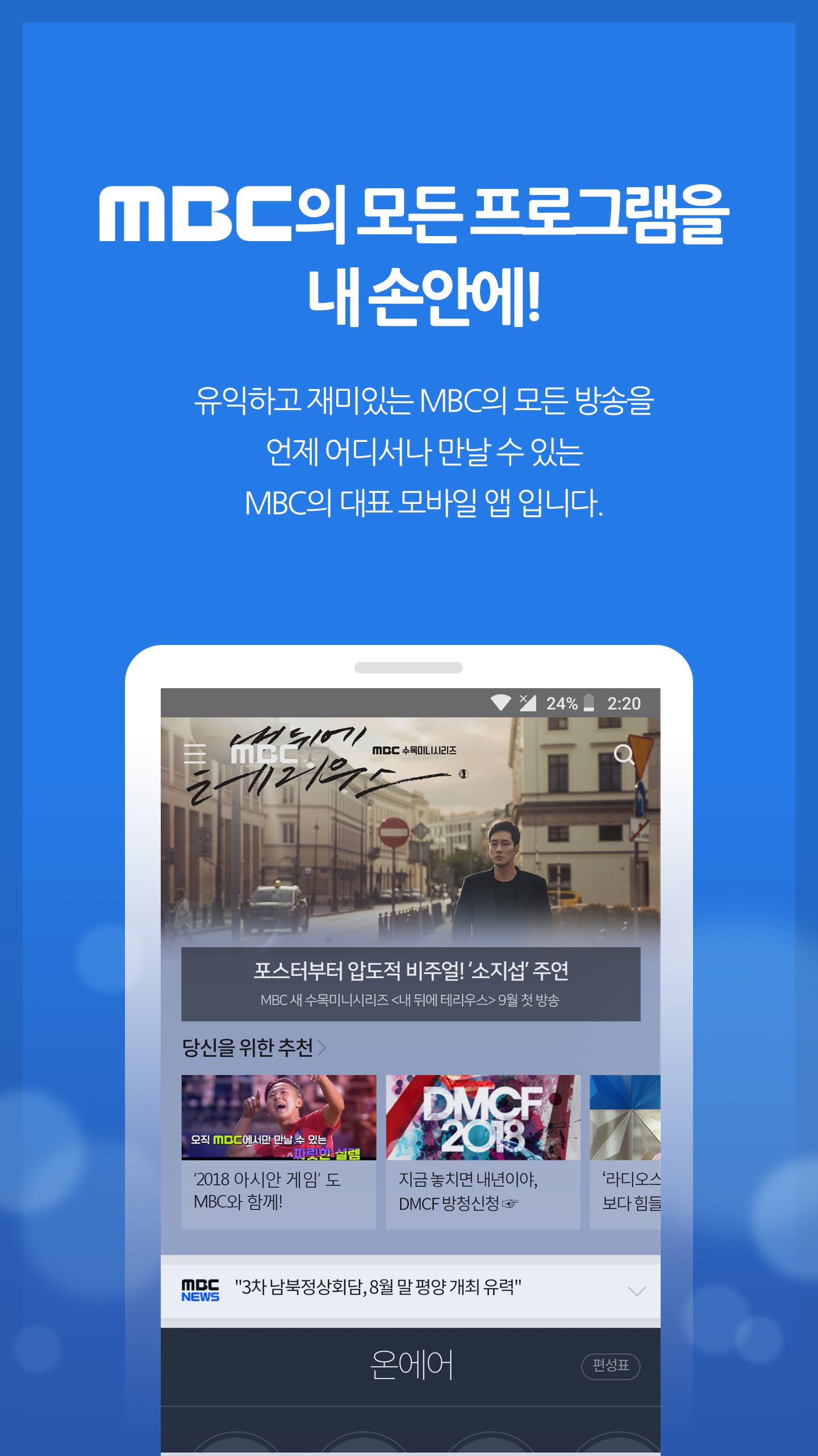 MBC 앱은 안드로이드, iOS 폰/태블릿에서 MBC 프로그램 외 국내외 최신/인기 영화를 언제 어디서나 이용할 수 있으며, MBC를 비롯한 MBC every1, MBC drama 등 실시간 온에어 채널을 무료로 이용할 수 있는 어플리케이션입니다.